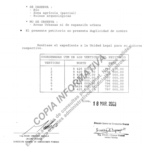 Expediente del petitorio de Valeria 23 2003 – Instituto Nacional de Concesiones y Catastro Minero