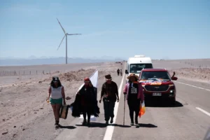Criticando la extracción de litio en el salar de Atacama hasta 2060, los impactos mineros en el agua y la salud, y la falta de participación ciudadana, comunidades atacameñas y organizaciones territoriales caminaron 100 kilómetros desde San Pedro hasta Calama entregando un petitorio a la delegación presidencial.